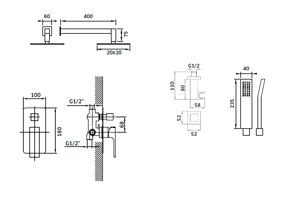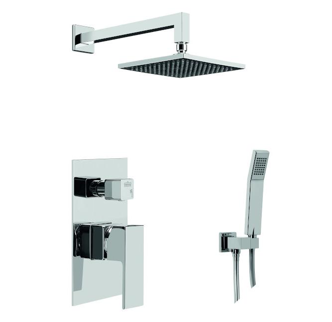 Composto por: Monocomando de 2 vias + Braço de Chuveiro + Chuveiro de Teto + Suporte de Chuveiro + Chuveiro de Mão + Ligação